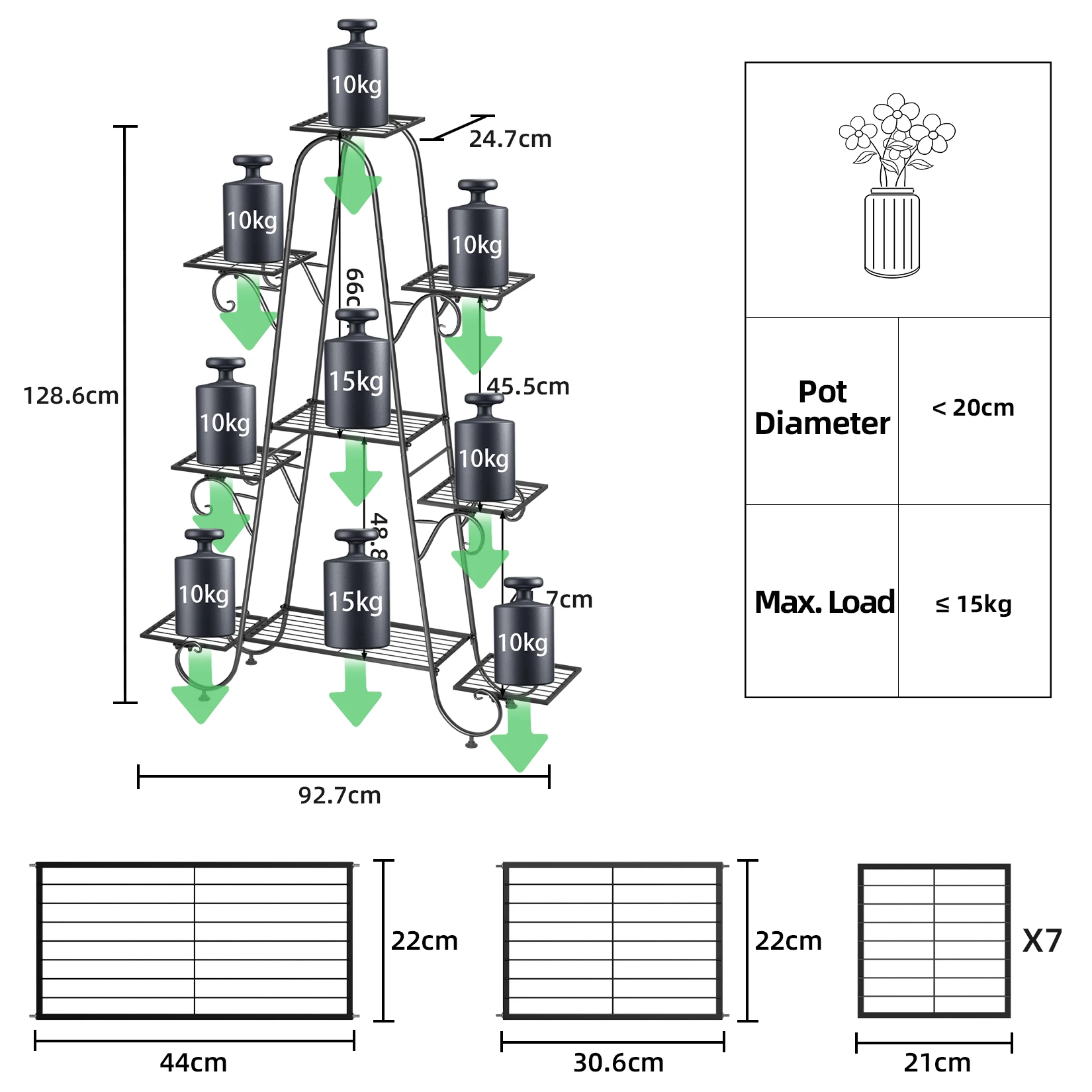 Each tier holds up to 22lbs(10kg) weight.